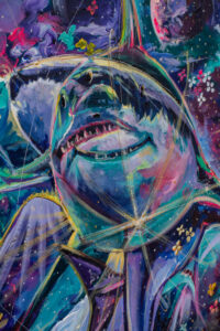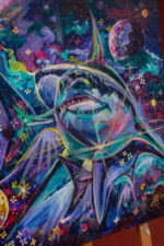 The surrealism of the sharks’ presence suggests a hidden narrative, perhaps hinting at an unseen force that governs the cosmos. The sharks become celestial hunters, their movements guided by an unknown force, their gaze fixed on a distant target. The painting invites us to ponder the mysteries of the universe, the forces that shape our existence, and the possibility of unseen entities lurking in the vastness of space.
