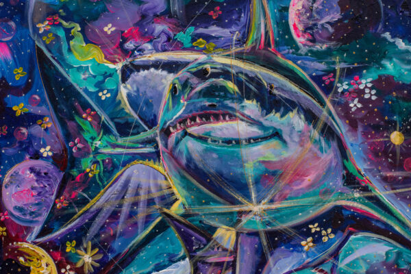 The surrealism of the sharks’ presence suggests a hidden narrative, perhaps hinting at an unseen force that governs the cosmos. The sharks become celestial hunters, their movements guided by an unknown force, their gaze fixed on a distant target. The painting invites us to ponder the mysteries of the universe, the forces that shape our existence, and the possibility of unseen entities lurking in the vastness of space.