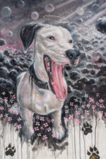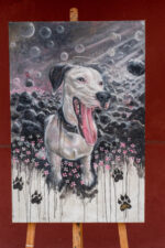 The canvas blooms with a symphony of grey and pink, a field of delicate petals that mirror the warmth in Ruby’s heart. Her paws, leaving gentle imprints upon this floral paradise, are a testament to the joy she brings. Each step, a whisper of love, a testament to the bond share domestically . The halo that crowns her head, a radiant glow, speaks not of divinity, but of the pure, unadulterated love that shines from within. Ruby, a beacon of joy, her tongue lolling out in a silent symphony of happiness, reflects the boundless love she holds for you.