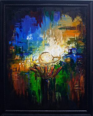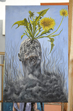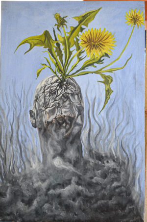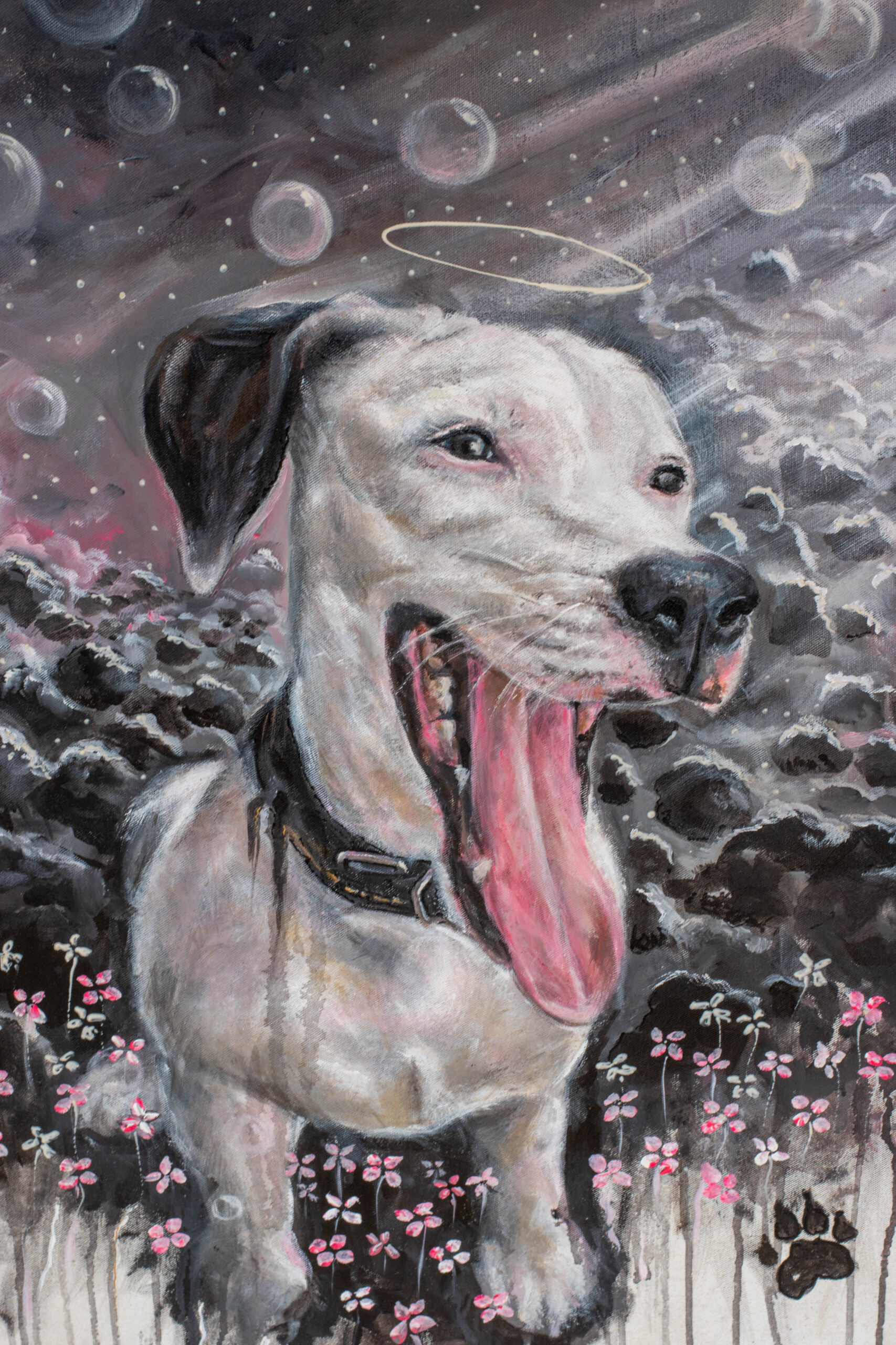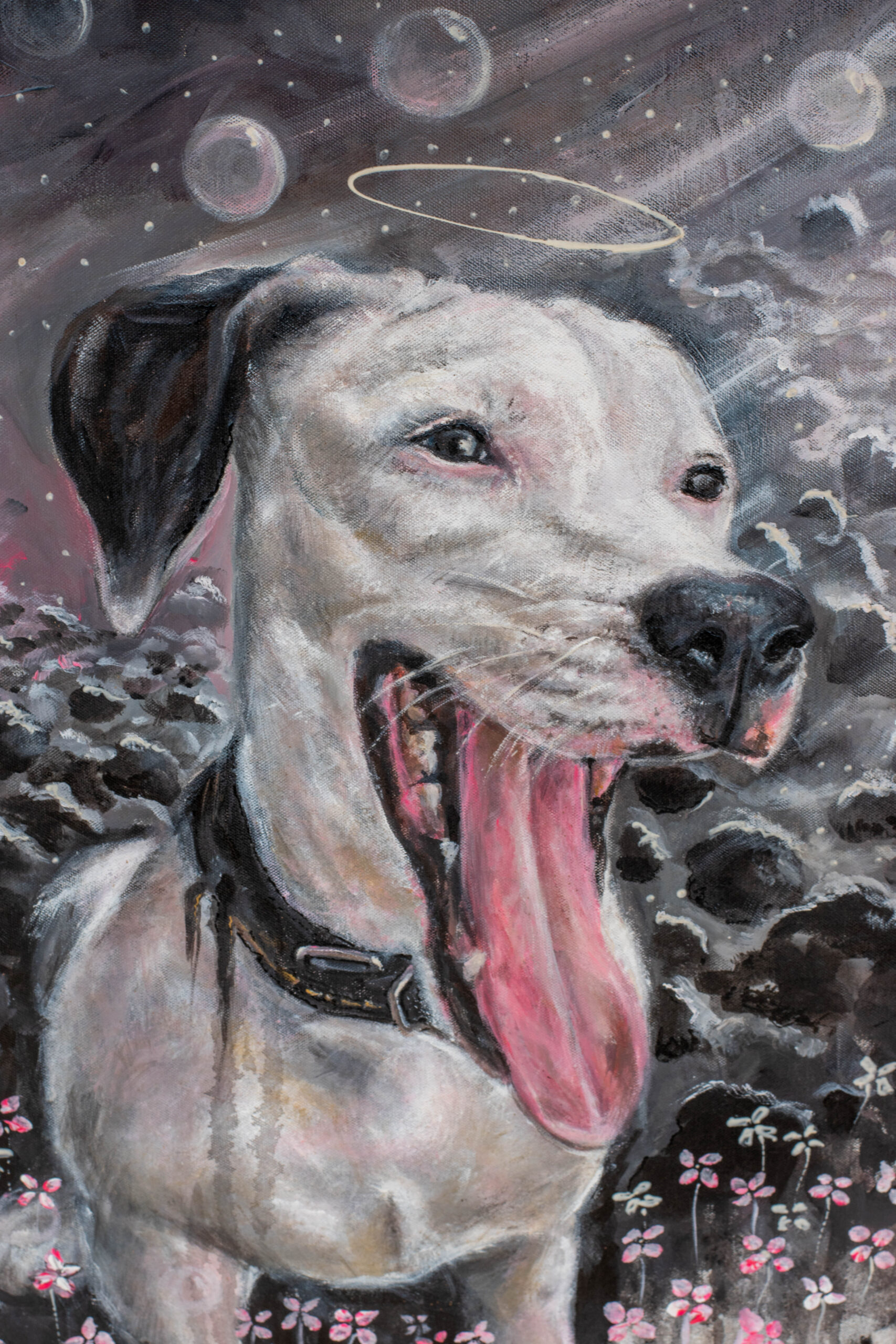 The canvas blooms with a symphony of grey and pink, a field of delicate petals that mirror the warmth in Ruby’s heart. Her paws, leaving gentle imprints upon this floral paradise, are a testament to the joy she brings. Each step, a whisper of love, a testament to the bond share domestically . The halo that crowns her head, a radiant glow, speaks not of divinity, but of the pure, unadulterated love that shines from within. Ruby, a beacon of joy, her tongue lolling out in a silent symphony of happiness, reflects the boundless love she holds for you.